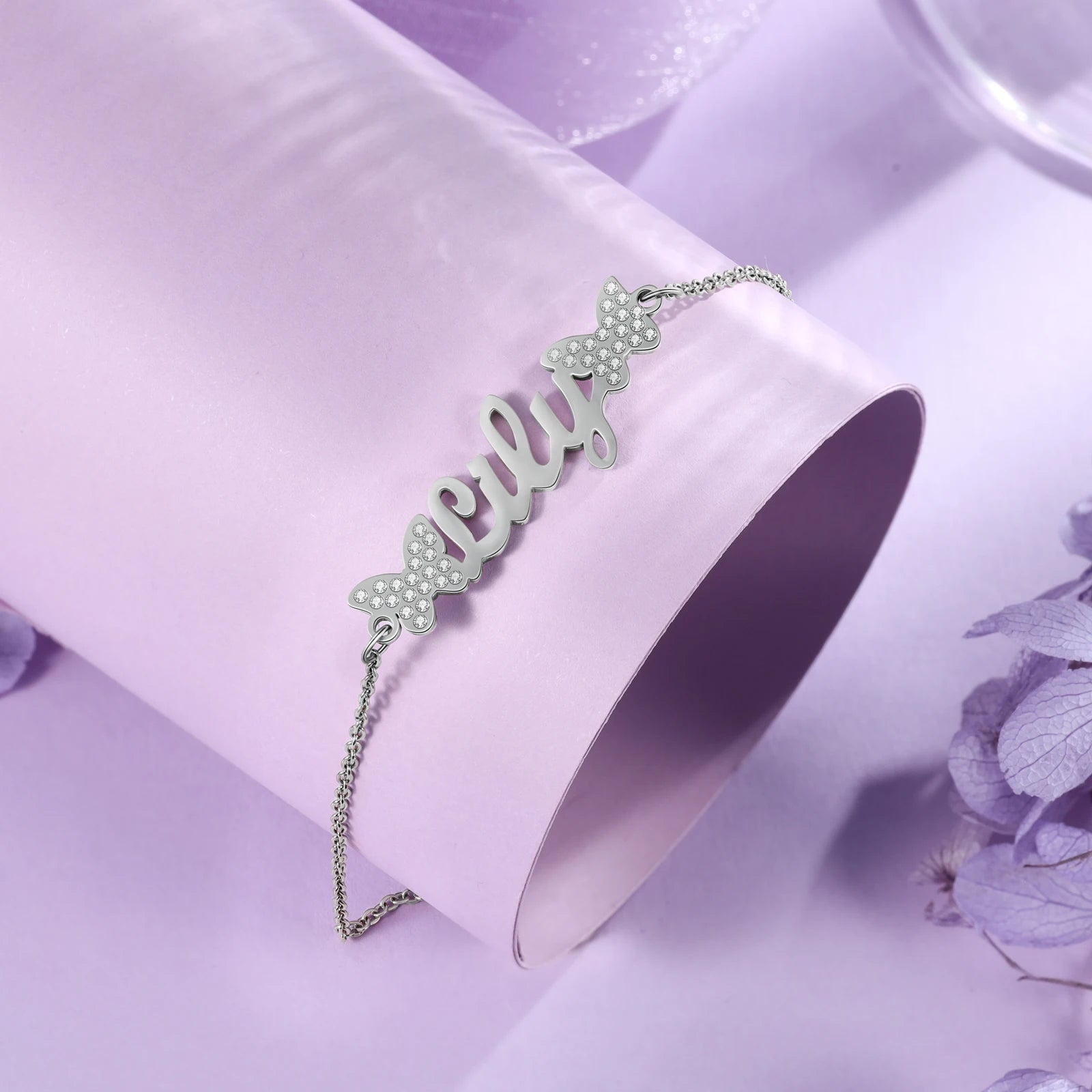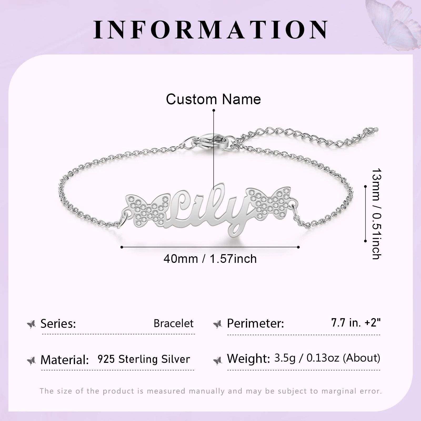Flutter into her heart with the Butterfly Bookend Personalized Nameplate Bracelet, a delightful piece for women who adore cute, romantic jewelry. Handcrafted from 100% 925 sterling silver, this fashion bracelet features a custom nameplate pendant adorned with two delicate butterfly accents, symbolizing love and transformation. Personalize it with a name of your choice, making it a truly unique treasure. Weighing just 3.5g, this lightweight bracelet measures 7.7 inches with a 2-inch extender for a perfect fit. Ideal as a Christmas gift, it’s a thoughtful way to celebrate a loved one—whether a friend, girlfriend, or wife. This eco-friendly chain-and-link bracelet arrives beautifully packaged, ready to bring joy to her special day.