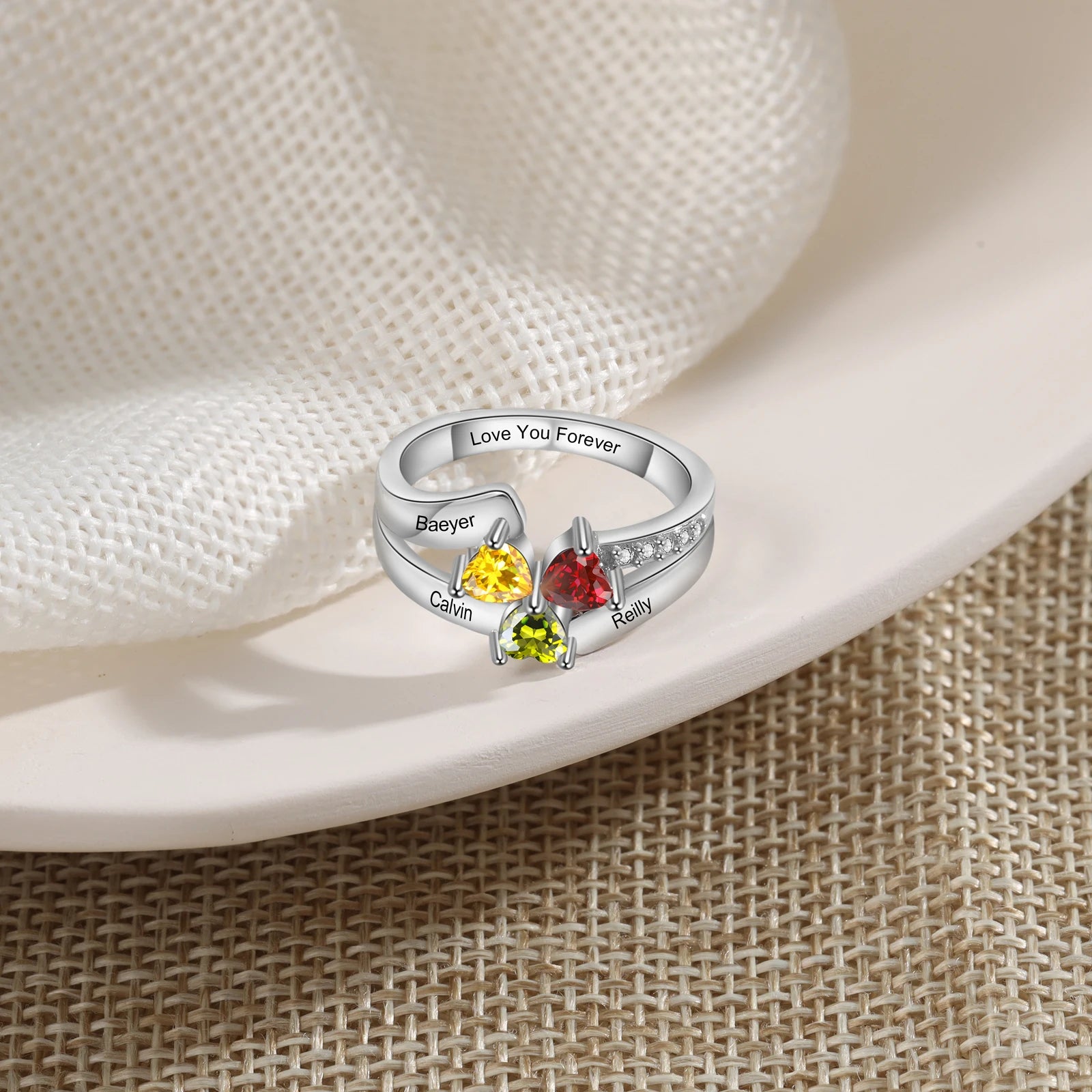 Celebrate love and connection with the Timeless Hearts Custom Birthstone Ring, a stunning piece for women who value sentiment and elegance. Handcrafted from 100% 925 sterling silver, this fine jewelry ring features 2-4 heart-shaped simulated birthstones, customizable in your chosen colors to represent your loved ones. Add a personal touch with free engraving—include names of a lover, parent, friend, sister, or grandparent on the band, plus a hidden inside message for an extra layer of meaning. With a beautiful zircon side stone setting, this classic heart-patterned ring offers lasting sparkle and comfort. Perfect as a mother’s ring, promise ring, or engagement ring, it’s an ideal gift for anniversaries, Christmas, birthdays, Valentine’s Day, or Mother’s Day. Surprise a friend, lover, girlfriend, fiancée, wife, mother, or grandma with this elegant treasure, beautifully packaged and ready to cherish.